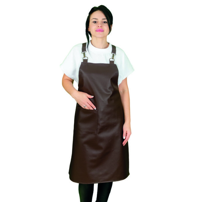 Delantal marrón de polipiel. Este delantal ofrece resistencia y durabilidad. La cinta marrón cruzada en la espalda y los mosquetones en el peto le da un toque moderno y aportan comodidad. Cuenta con un bolsillo lateral. Espalda cruzada con cinta marrón de tejido 50% poliéster, 50% algodón, de 3 cm de ancho. Dos ollaos en cintura.