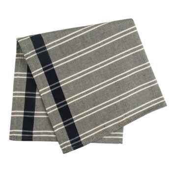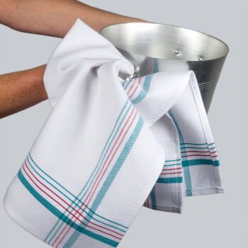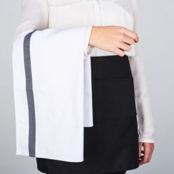 Paños de cocina blancos con cenefa de color negro. Hechos de sarga 100% algodón y con un gramaje y tamaño superiores al convencional, son indispensables para todas las tareas de la cocina desde secarse las manos hasta sacar bandejas del horno. Perfectos para los profesionales que buscan paños de gran calidad y durabilidad, sin renunciar a la suavidad. Se venden en paquetes de 12 unidades.
